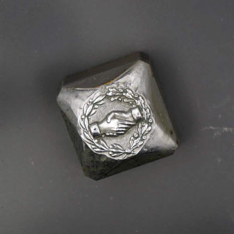 Poignée de main franc-maçonnique entourée d’une couronne de feuilles de laurier et de chêne.