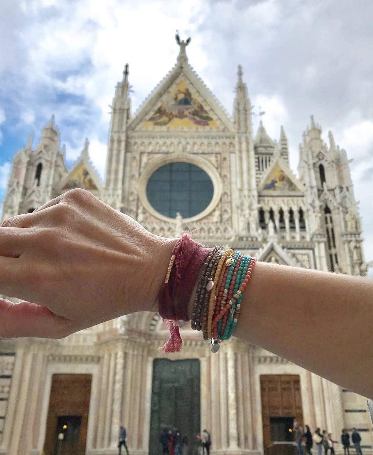 Les bracelets permettent de faire trois tours de poignet ou d’être porté en collier. L’ensemble des perles de bohème facettées est assemblé sur un lien de silicone très résistant.