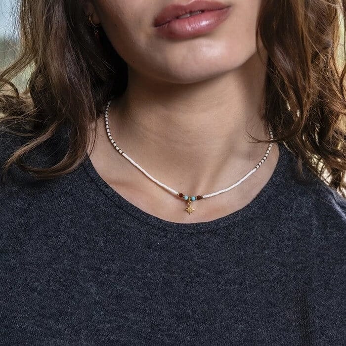 Le Collier Polaire Gold Vanille en Perles japonaises Miyuki est façonné à la main par les artisans Têtes Blondes dans leur atelier d’Aix en Provence.