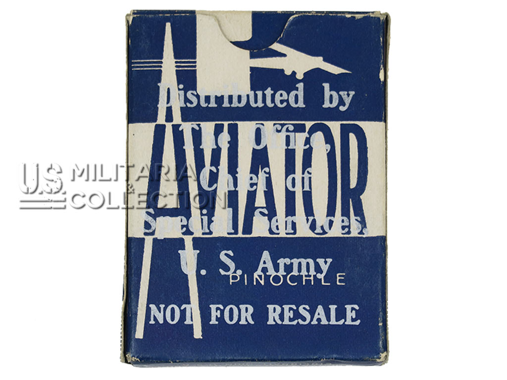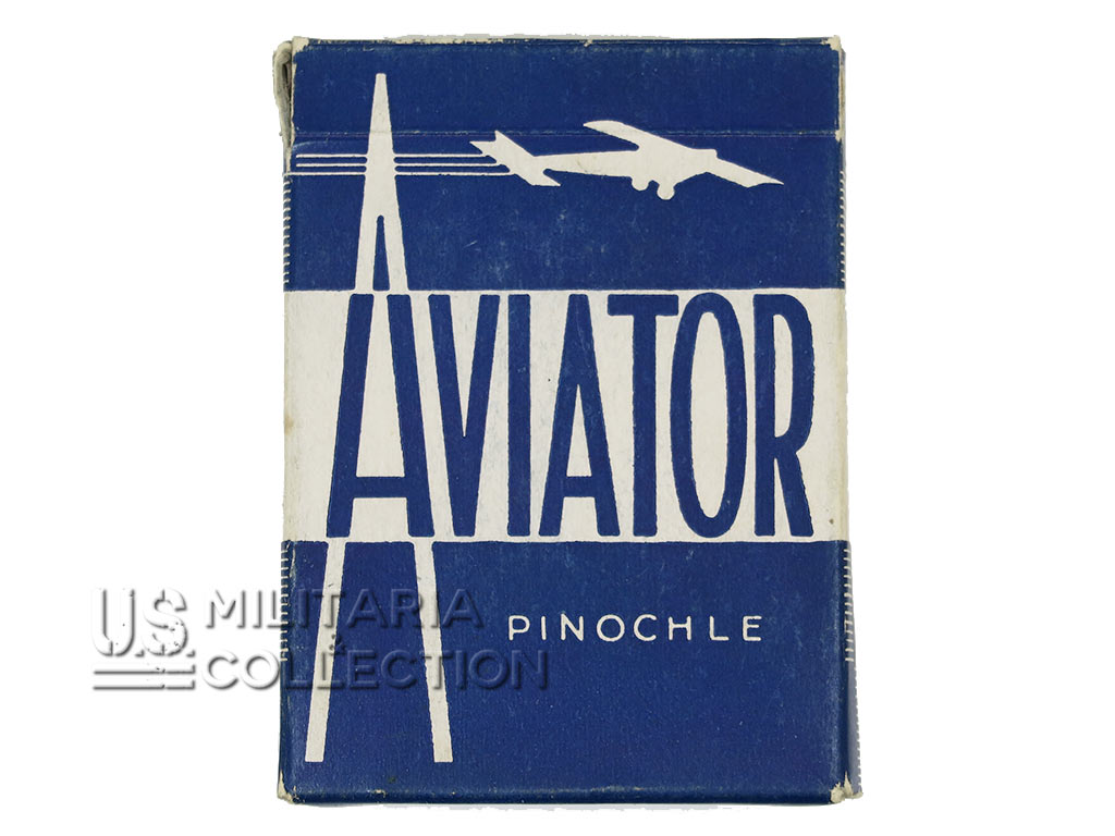 Jeu de Pinochle Aviator distribué par The Office Chief of Special Services US Army. Cartes de jeu produites par The United States Playing Card Co. à Cincinnati dans l’Ohio, U.S.A. Le jeu de Pinochle est un jeu de cartes américain proche de la belote, il se pratique avec 48 cartes.