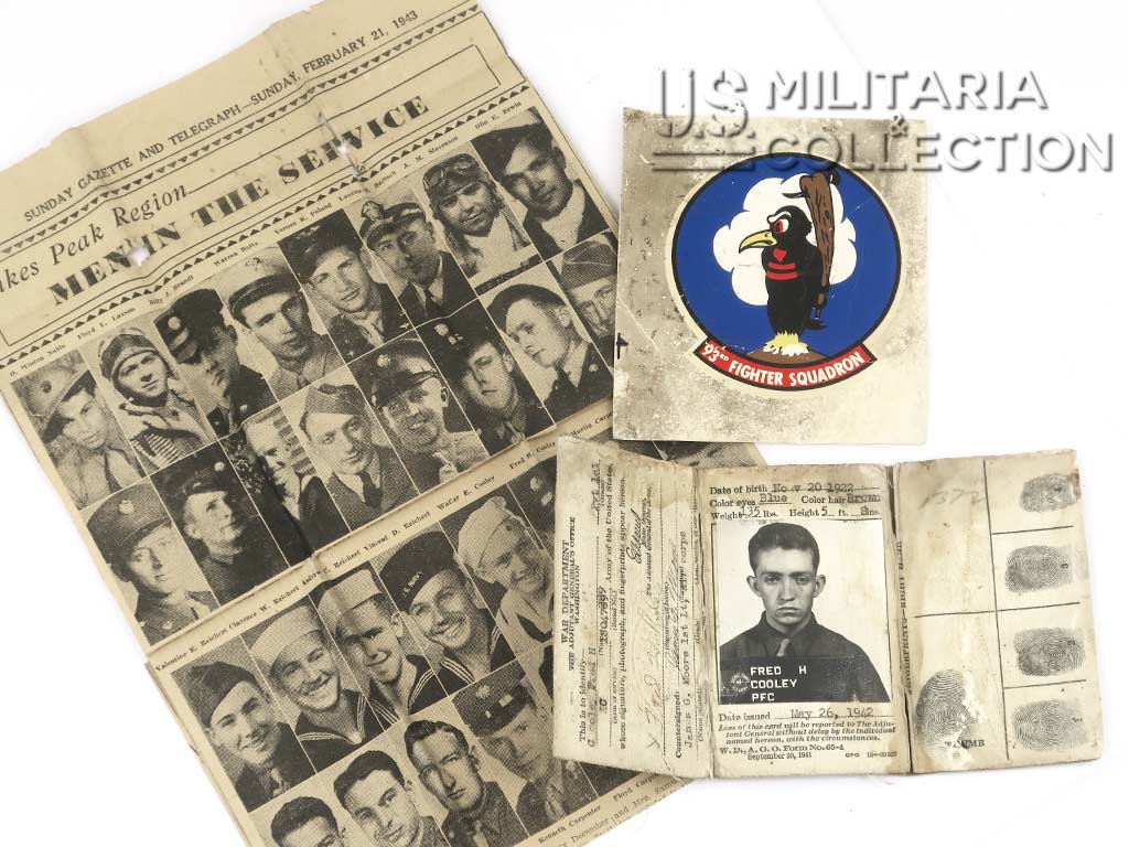 Une Identification Card du War Department : Fred Cooley matricule 18047289 affecté au 93rd Fighter Squadron (93e escadre de chasse, USAAF) le Le 93rd Fighter Squadron a combattu en Afrique du Nord, Sicile, Italie,….