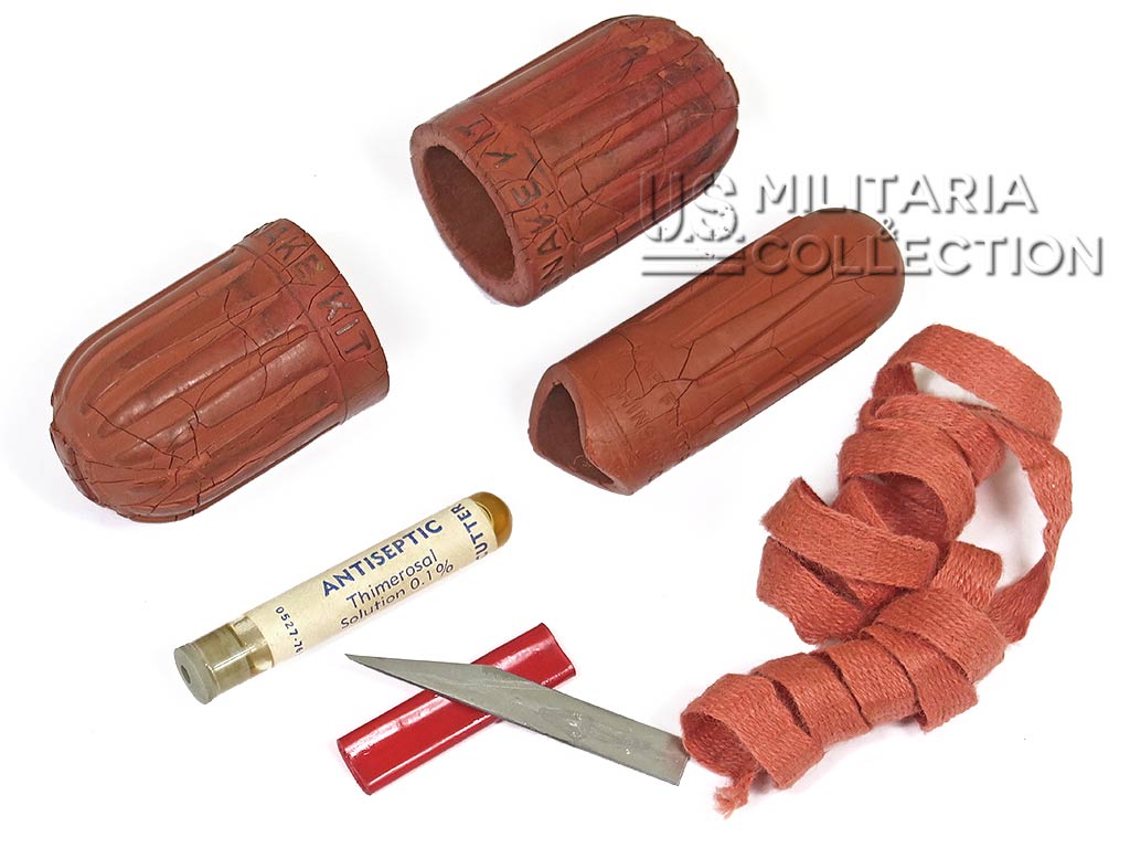 Kit morsure de serpent US produit de 1944 aux années 60. Ce type de kit issu du marché civil fut utilisé par nombre de soldats américains combattant dans la jungle. De petite taille, il était bien souvent utilisé en complément du First Aid kit M2 Jungle. Le Cutter Snake Bite Kit est composé d’une lame chirurgicale, d’un flacon d’antiseptique. D’un lacet faisant office de garrot. Après avoir désinfecté la lame chirurgicale avec l’antiseptique, de petites entailles en forme de croix étaient pratiquées autour de la partie ayant été mordue. Le garrot était placé au dessus du membre. Les bouchons du kit qui sont en caoutchouc souple étaient alors utilisés comme ventouses pour extraire le venin. La partie intérieure du kit est destinée à extraire le venin des parties articulées (doigts, tibias,..). Fabrication par la firme Cutter Laboratories fondée en 1897, localisée à Berkeley en Californie. A partir des années 60 la marque Cutter fut estampée aux deux extrémités du kit. État général : usure. Le caoutchouc a durcit du fait de son ancienneté. Restes de liquide antiseptique dans la petite fiole en verre. Notice d’utilisation absente.