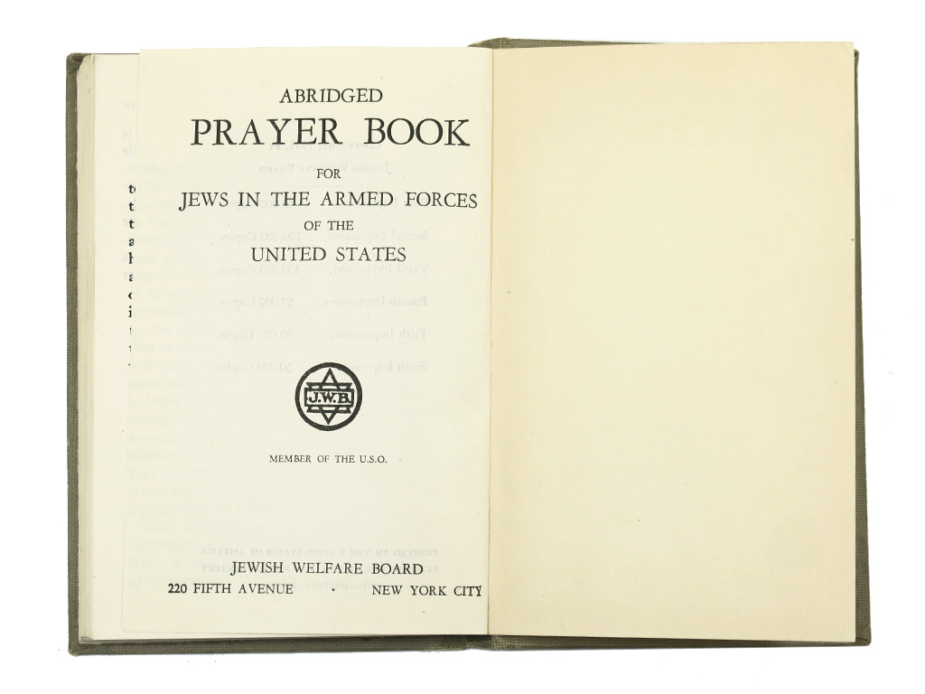 Livret, recueil de prières abrégé destiné aux soldats juifs origine Seconde Guerre mondiale. Livret destiné aux soldats de confession juive servant dans les forces armées des États-Unis. Abridged Prayer Book for Jews in the Armed Forces of the United States a été publié par le Jewish Welfare Board. Organisation affiliée à l’USO (United Service Organizations), qui soutenait les militaires américains et leurs familles. Le but de ce livret est de fournir un soutien spirituel et religieux aux soldats juifs, même lorsqu’ils sont éloignés de leur communauté ou en service actif.