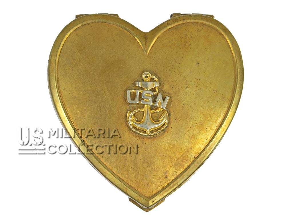 Poudrier destiné au personnel féminin de l’armée américaine, origine Seconde Guerre mondiale. Poudrier en laiton ou bronze doré avec insigne en laiton aux armes de l’US Navy. Marquage intérieur du fabriquant : Superb USA. L’ouverture se fait par le bouton qui se trouve à l’extrémité du poudrier, le poudrier comprend un compartiment pour la poudre de riz, et un miroir.