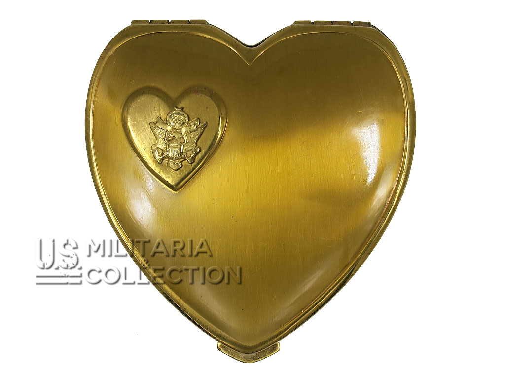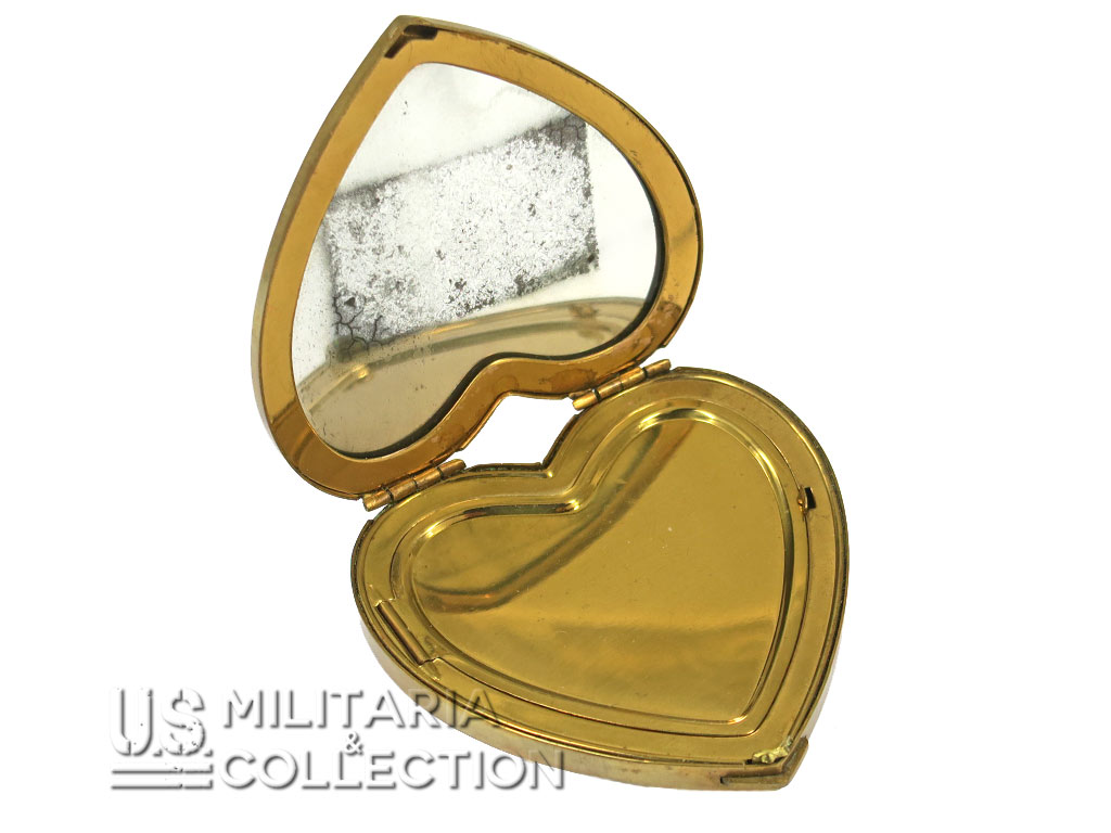 Poudrier féminin US Army Origine Seconde Guerre mondiale. Fabrication en laiton ou métal doré avec insigne aux armes de l’US Army. Ce poudrier destiné au personnel féminin de l’US Army ou aux petites amies des soldats était vendu dans les PX. Le poudrier comporte un compartiment pour la poudre de riz avec son tamis, sa houppette et son miroir. L’ouverture se fait par le bouton qui se trouve à l’extrémité du poudrier.