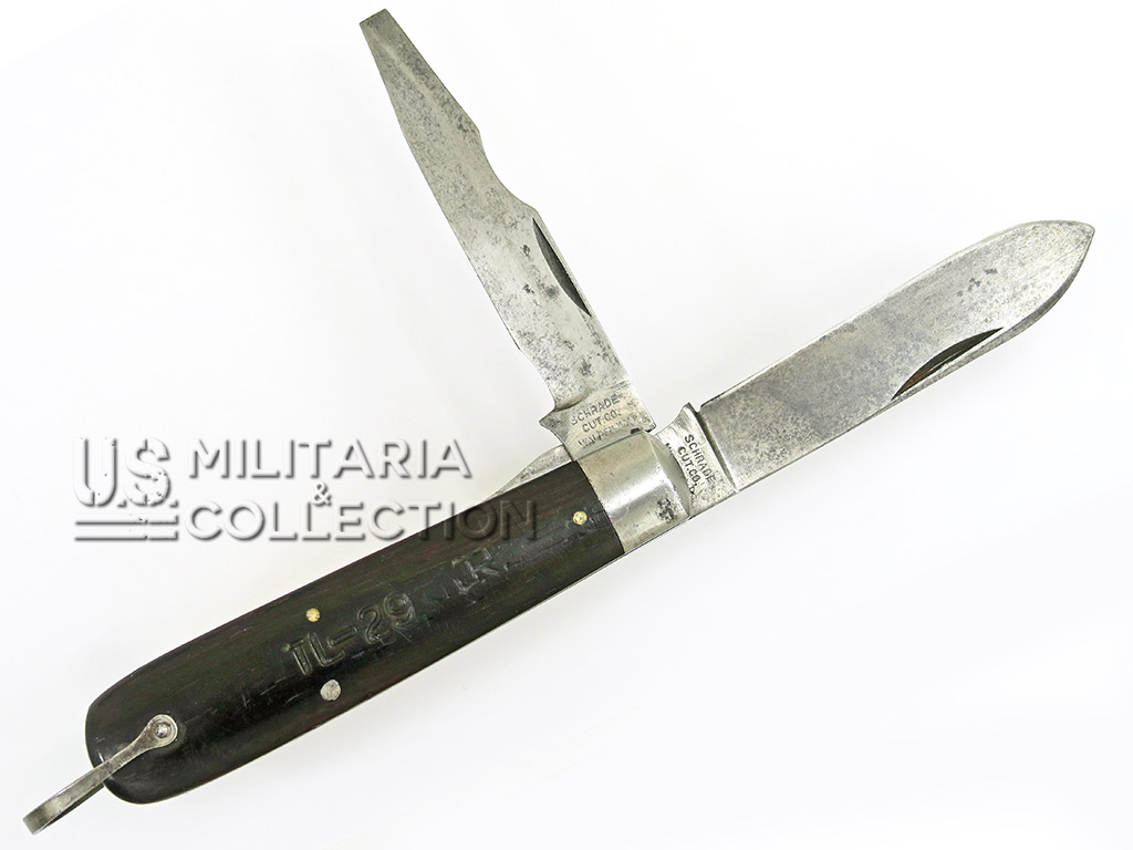 Rare couteau TL-29 produit par la coutellerie SCHRADE CUT. CO. WALDEN, N.Y. origine Seconde Guerre mondiale. Ce couteau de poche produit par la Schrade Cutlery Company fait parti des TL-29 les plus difficiles à trouver du fait de sa faible production et du fait que la Schrade Cutlery Co., fut vendue en 1946 à l’Imperial Knife Associated Companies, devenant ainsi la Schrade-Walden Cutlery Co., Inc.