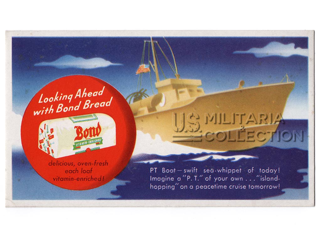 Carton publicitaire patriotique Bond Bread avec vedette lance torpilles ou PT Board (short for patrol torpedo boat), origine Seconde Guerre mondiale. Epais carton, une face imprimée, parfait état de conservation.