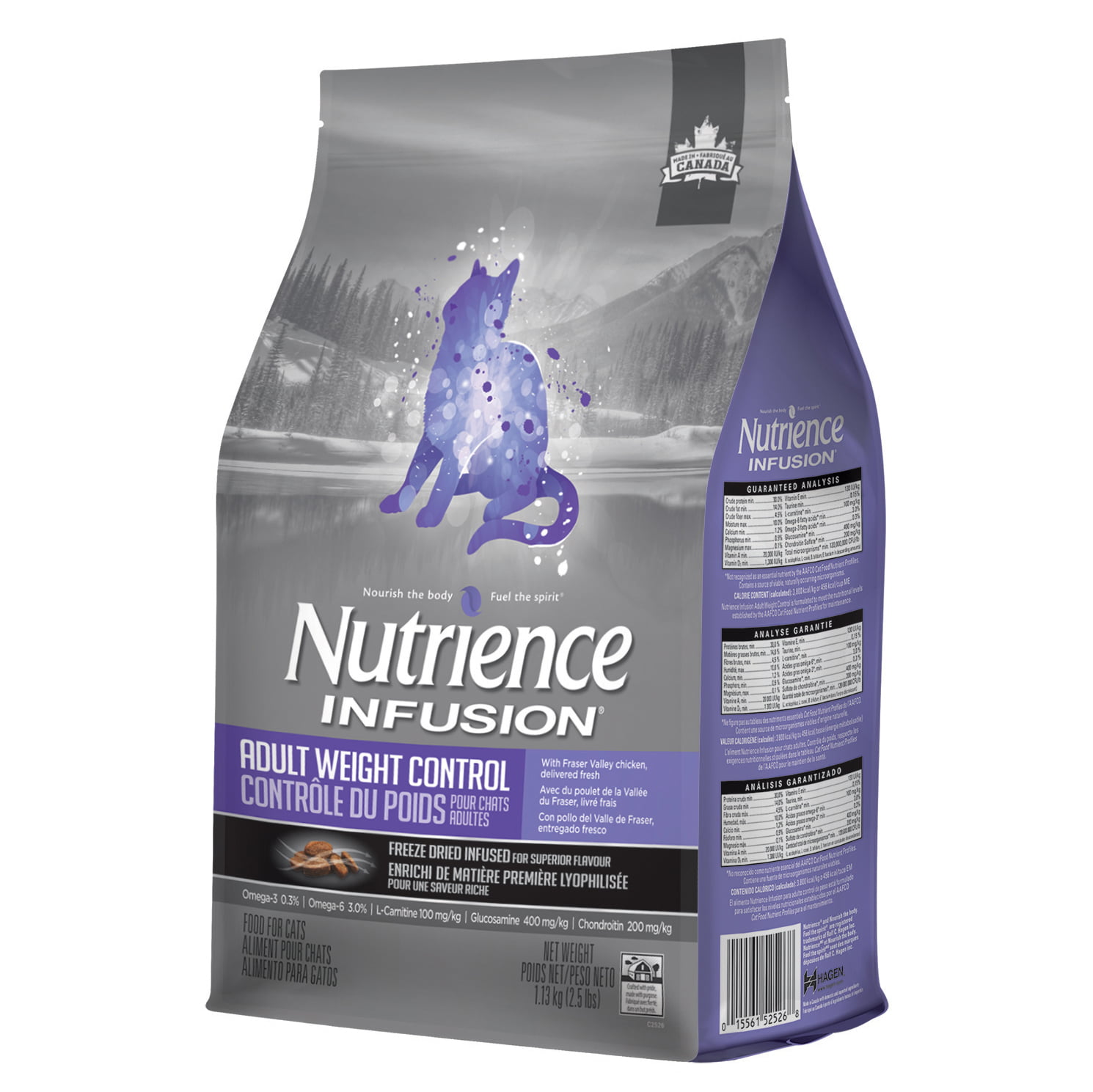 Les aliments Nutrience Infusion sont fabriqués au Canada et combinent du poulet frais jamais congelé, des grains entiers à faible indice glycémique, ainsi que des fruits, des légumes et des espèces herbacées riches en nutriments.