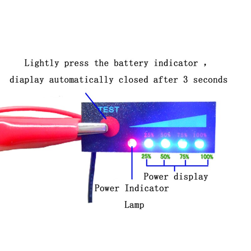 2. Connectez le terminal positif et négatif du panneau d’affichage et connectez-le aux extrémités positives et négatives de la batterie à tester. Appuyez légèrement sur le bouton rouge avec votre doigt et la lampe IED s’allume pour afficher la puissance de la batterie en temps réel.