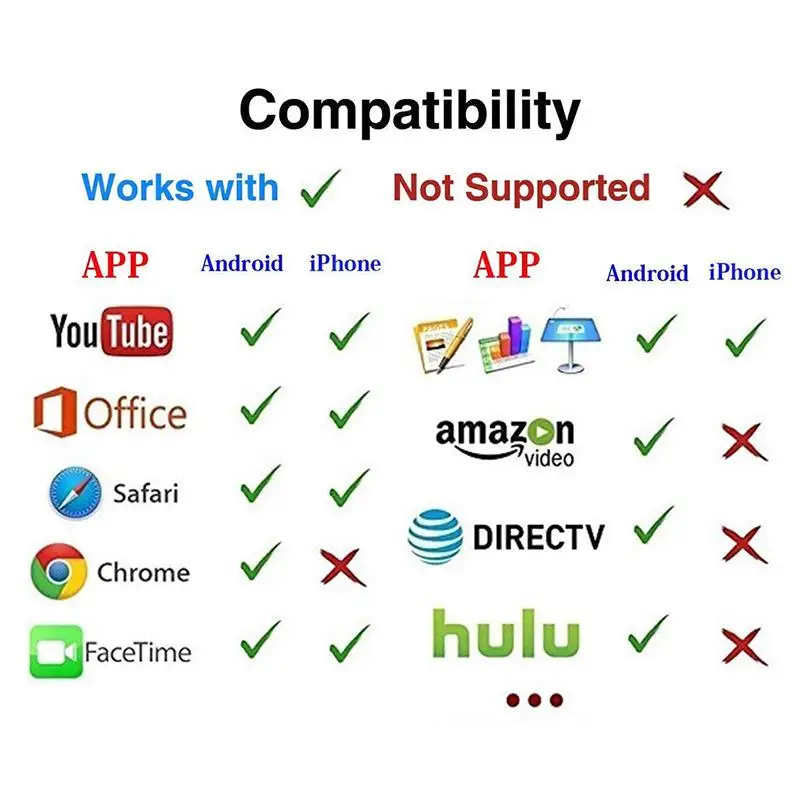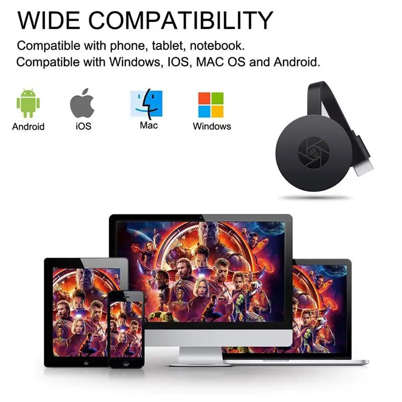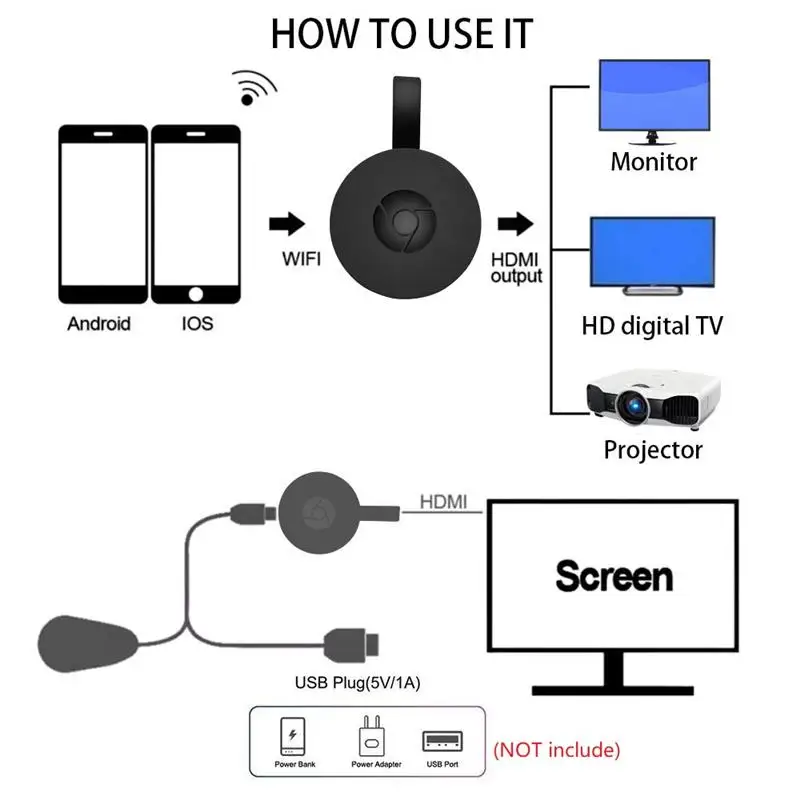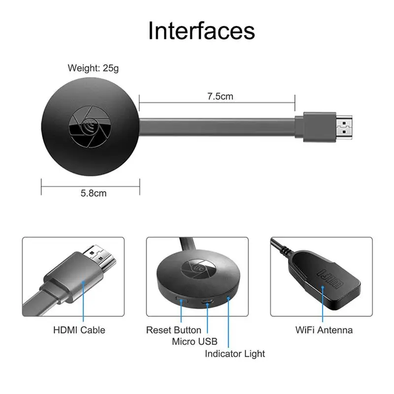 Aucune application ou pilote logiciel n’est requis. En trois étapes seulement, vous pouvez facilement profiter de la musique, des vidéos, des photos, des fichiers office et des sites web sur grand écran: insérer-> connecter-> Mirror. Branchez-le sur l’interface HDMI du téléviseur et utilisez une alimentation 5V/500mA, puis connectez l’appareil en mode Miracast, Airplay ou DLNA avec des instructions, et enfin miroir les médias sur grand écran.