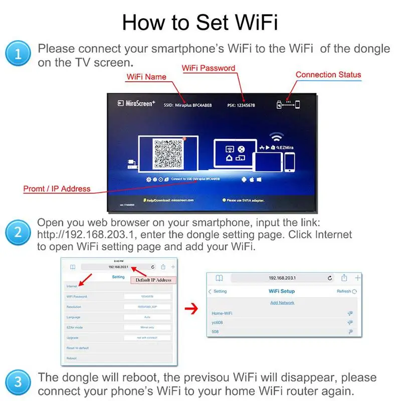 Étape 4: démarrez le navigateur (https://192.168.203.1) sur le téléphone et configurez Internet pour MiraScreen (choisissez le signal du routeur domestique).