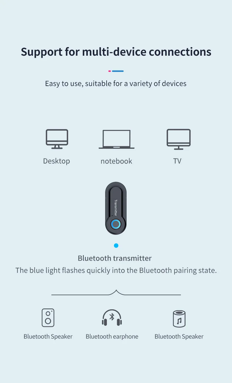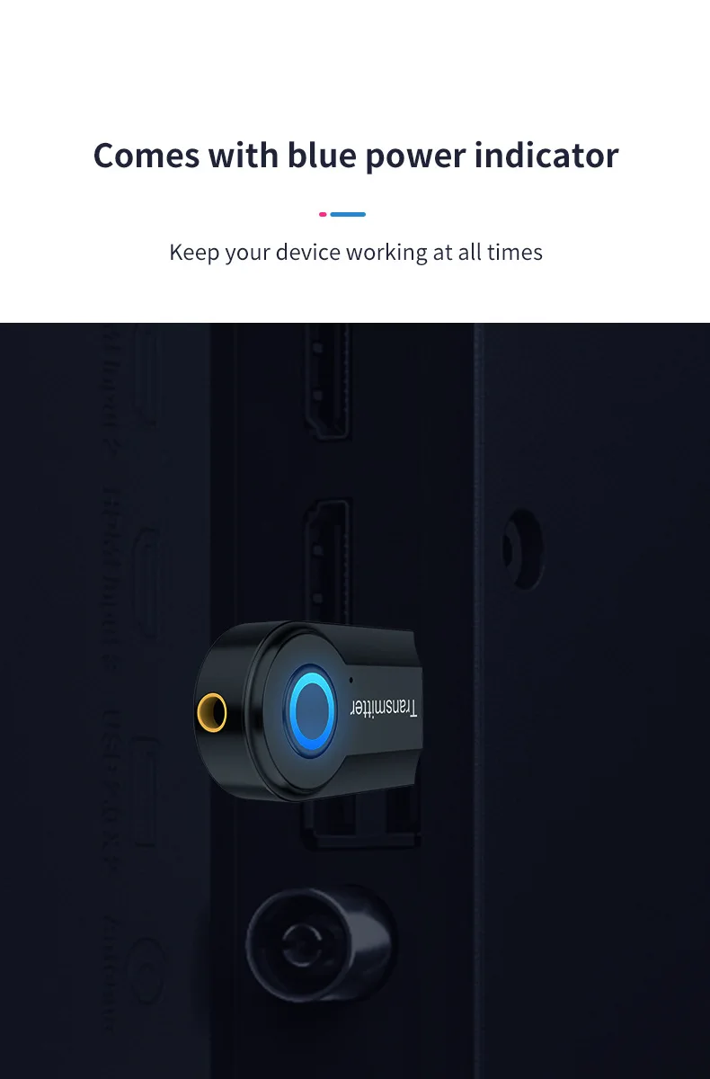 Le dispositif émetteur sans fil audio stéréo Bluetooth peut être utilisé avec des appareils numériques avec des appareils Bluetooth (tels que des haut-parleurs Bluetooth ou des casques Bluetooth, etc.) pour obtenir une transmission audio haute fidélité sans fil à l’intérieur. Cet émetteur/récepteur Bluetooth peut être utilisé dans presque tous les produits numériques avec sortie audio (interface audio 3.5mm), il suffit de relier l’audio au port d’entrée. Y compris les ordinateurs, les téléviseurs et tous les autres produits qui n’ont pas leur propre fonction d’émetteur Bluetooth.
