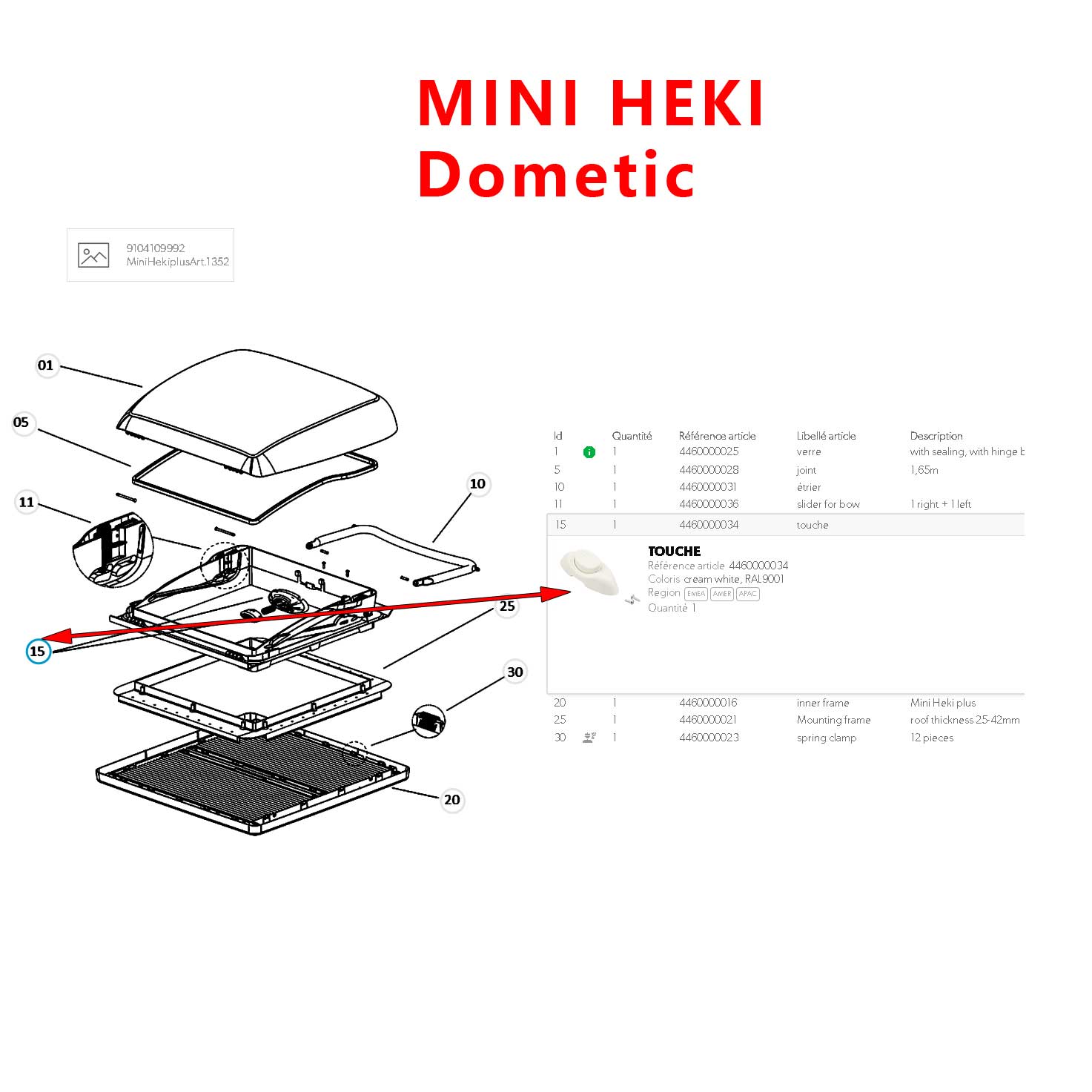 Pour vérifier si votre lanterneau Mini heki comporte bien ce bouton, merci de nous contacter et munissez vous pour vérifier la compatibilité de votre numéro de produit de votre appareil Dometic (qui se trouve sur l’étiquette signalétique de votre réfrigérateur).