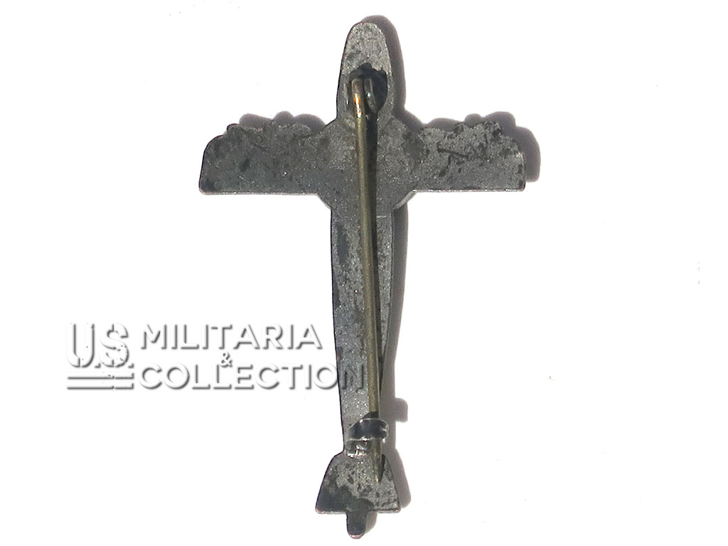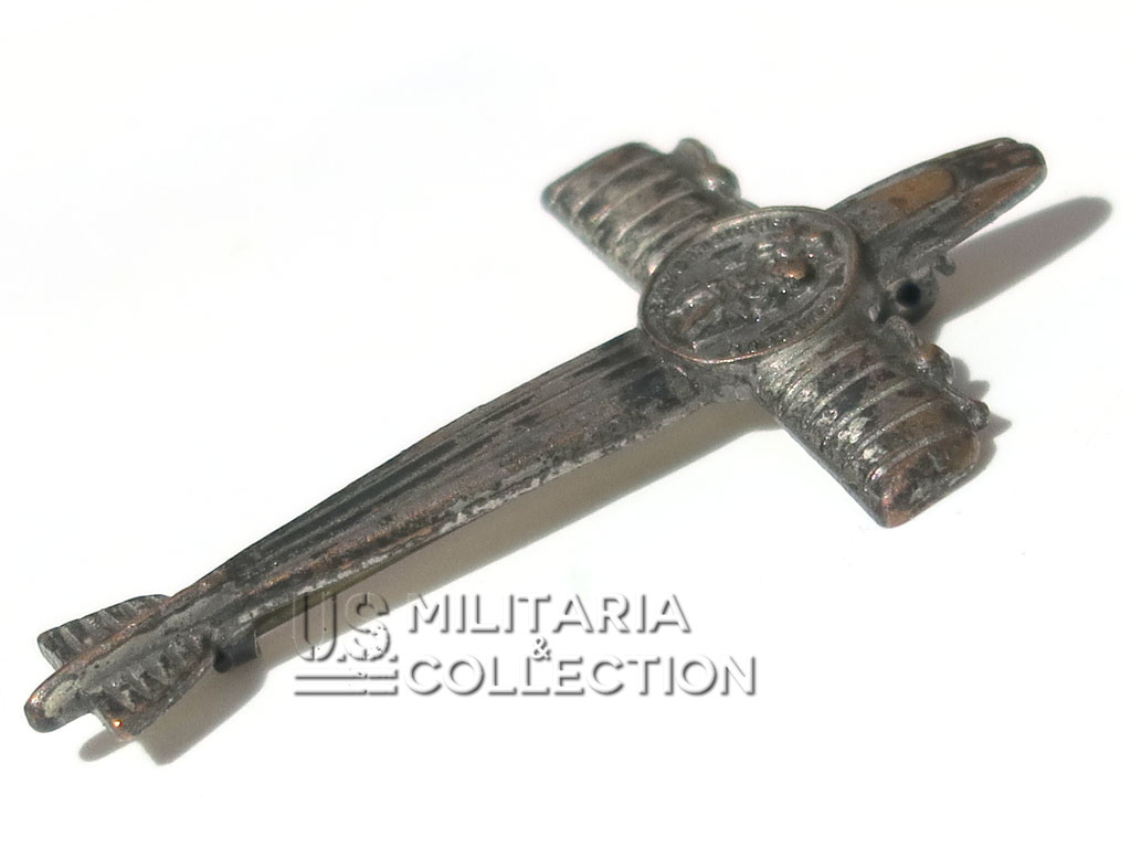 Broche américaine Seconde Guerre mondiale avec restes de plaquage argent, marquage « Saint Christopher protect us ». Pièce de terrain état moyen, provenance secteur d’Azeville.