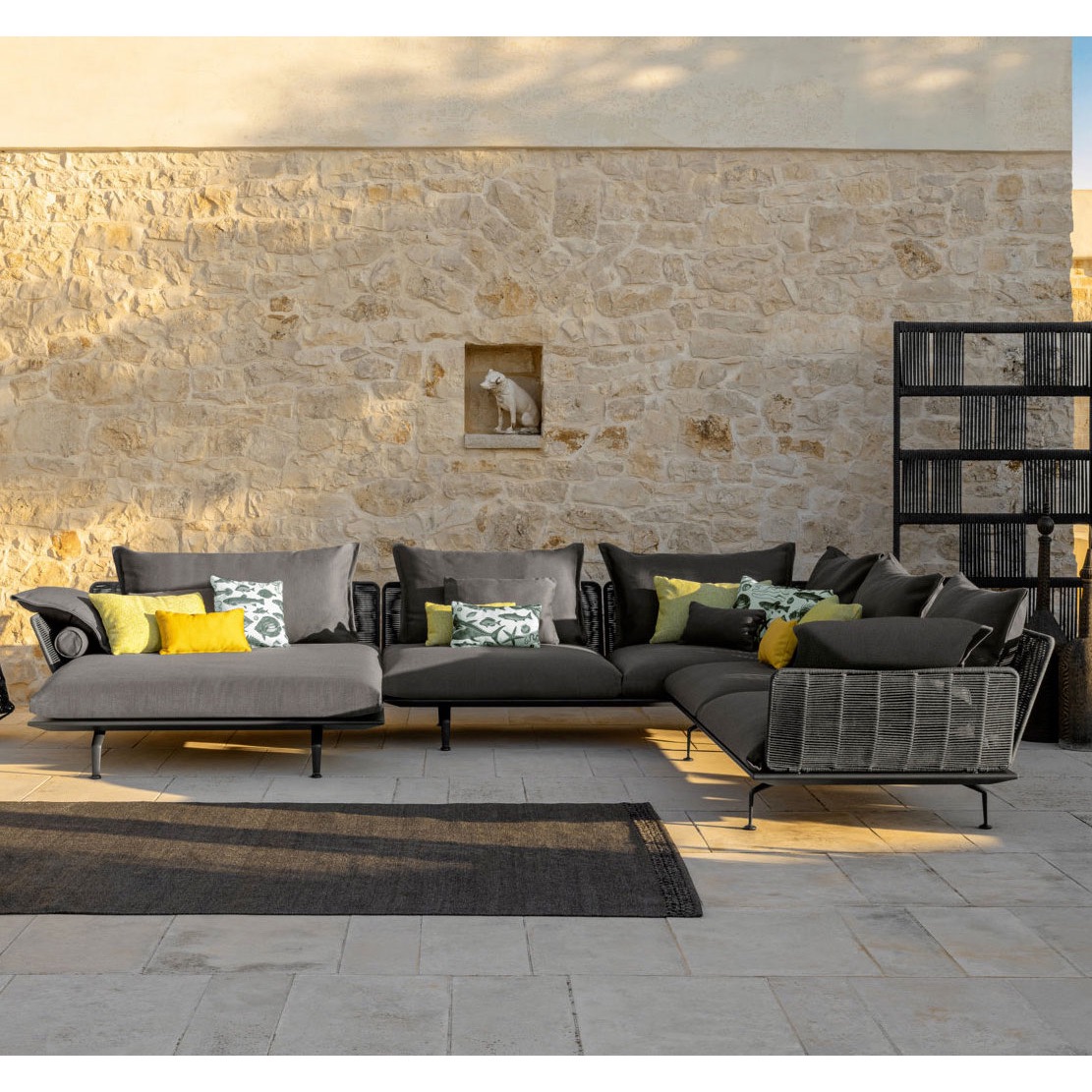 La structure en aluminium moulé sous pression permet d’assurer l’ensemble de la stabilité du canapé. L’assise possède des coussins moelleux recouvert d’un tissu de qualité résistant aux intempéries et réalisé avec une mousse séchage rapide.