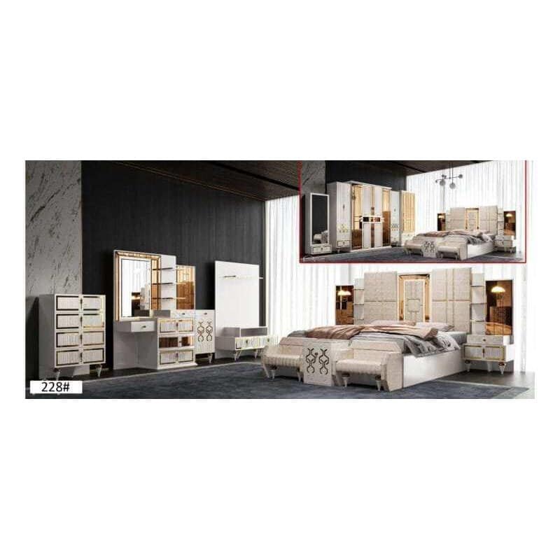 La Chambre à Coucher 228 Blanc Doré allie élégance classique et raffinement moderne pour transformer votre espace nuit en un véritable havre de paix. Conçue dans des tons blancs éclatants rehaussés de finitions dorées sophistiquées, elle apporte une touche de luxe et de lumière à votre intérieur. Ce mobilier complet inclut généralement un lit majestueux, des tables de chevet assorties, une armoire spacieuse et une commode avec miroir, alliant fonctionnalité et esthétique. Parfaite pour ceux qui recherchent un style chic et intemporel, cette chambre crée une atmosphère chaleureuse et harmonieuse.