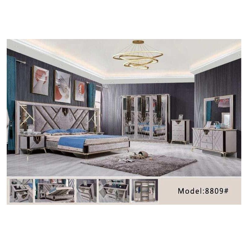 La Chambre à coucher 8809 Blanc Doré allie élégance classique et raffinement moderne pour créer un espace de repos luxueux. Avec sa finition blanche éclatante subtilement rehaussée de touches dorées, cette chambre apporte une atmosphère lumineuse et majestueuse à votre intérieur. Chaque élément du mobilier — du lit au design sophistiqué aux tables de chevet et à l’armoire assorties — est conçu avec soin pour offrir à la fois confort, fonctionnalité et style. Parfaite pour ceux qui recherchent une ambiance chic et royale, cette chambre transforme votre espace nuit en un véritable havre de paix.