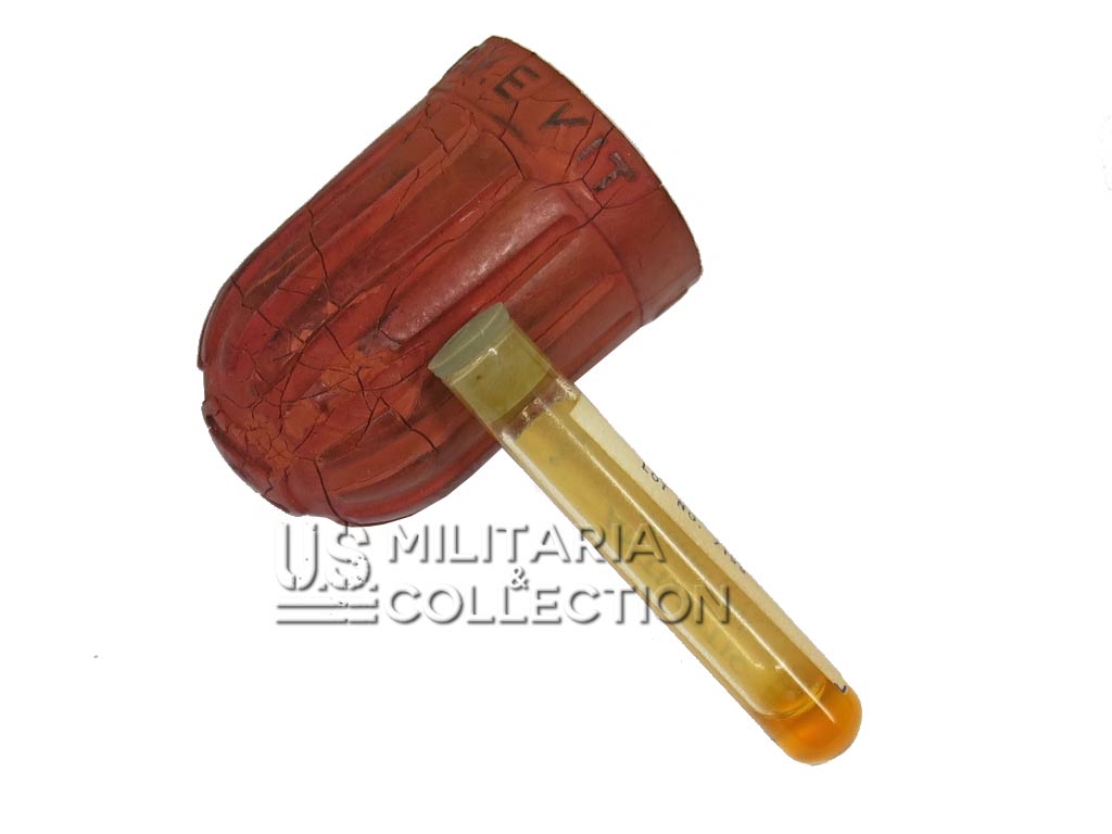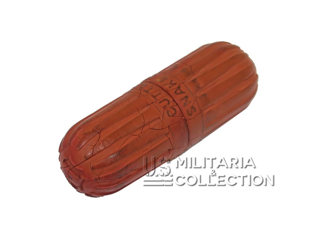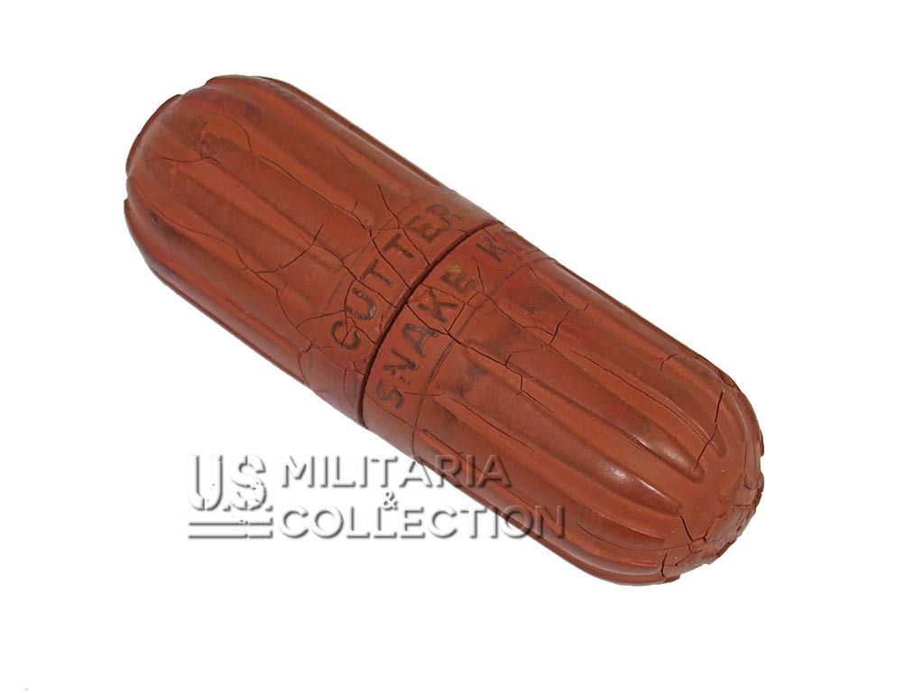 Kit morsure de serpent produit de 1944 aux années 60. Ce type de kit issu du marché civil fut utilisé par nombre de soldats américains combattant dans la jungle. De petite taille, il était bien souvent utilisé en complément du First Aid kit M2 Jungle. Le Cutter Snake Bite Kit est composé d’une lame chirurgicale, d’un flacon d’antiseptique. D’un lacet faisant office de garrot. Après avoir désinfecté la lame chirurgicale avec l’antiseptique, de petites entailles en forme de croix étaient pratiquées autour de la partie ayant été mordue. Le garrot était placé au dessus du membre. Les bouchons du kit qui sont en caoutchouc souple étaient alors utilisés comme ventouses pour extraire le venin. La partie intérieure du kit est destinée à extraire le venin des parties articulées (doigts, tibias,..). Fabrication par la firme Cutter Laboratories fondée en 1897, localisée à Berkeley en Californie. A partir des années 60 la marque Cutter fut estampée aux deux extrémités du kit. État général : usure. Le caoutchouc a durcit du fait de son ancienneté. Restes de liquide antiseptique dans la petite fiole en verre. Notice d’utilisation absente.