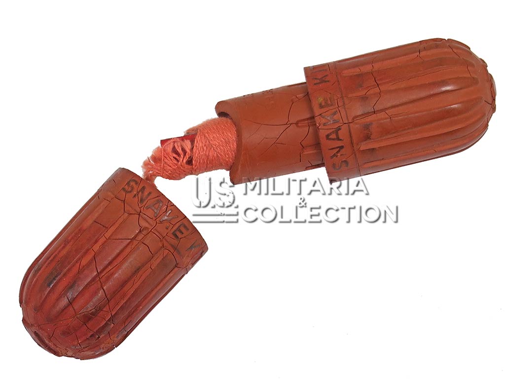 Kit morsure de serpent US produit de 1944 aux années 60. Ce type de kit issu du marché civil fut utilisé par nombre de soldats américains combattant dans la jungle. De petite taille, il était bien souvent utilisé en complément du First Aid kit M2 Jungle. Le Cutter Snake Bite Kit est composé d’une lame chirurgicale, d’un flacon d’antiseptique. D’un lacet faisant office de garrot. Après avoir désinfecté la lame chirurgicale avec l’antiseptique, de petites entailles en forme de croix étaient pratiquées autour de la partie ayant été mordue. Le garrot était placé au dessus du membre. Les bouchons du kit qui sont en caoutchouc souple étaient alors utilisés comme ventouses pour extraire le venin. La partie intérieure du kit est destinée à extraire le venin des parties articulées (doigts, tibias,..). Fabrication par la firme Cutter Laboratories fondée en 1897, localisée à Berkeley en Californie. A partir des années 60 la marque Cutter fut estampée aux deux extrémités du kit. État général : usure. Le caoutchouc a durcit du fait de son ancienneté. Restes de liquide antiseptique dans la petite fiole en verre. Notice d’utilisation absente.