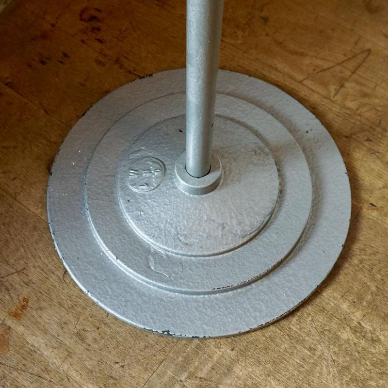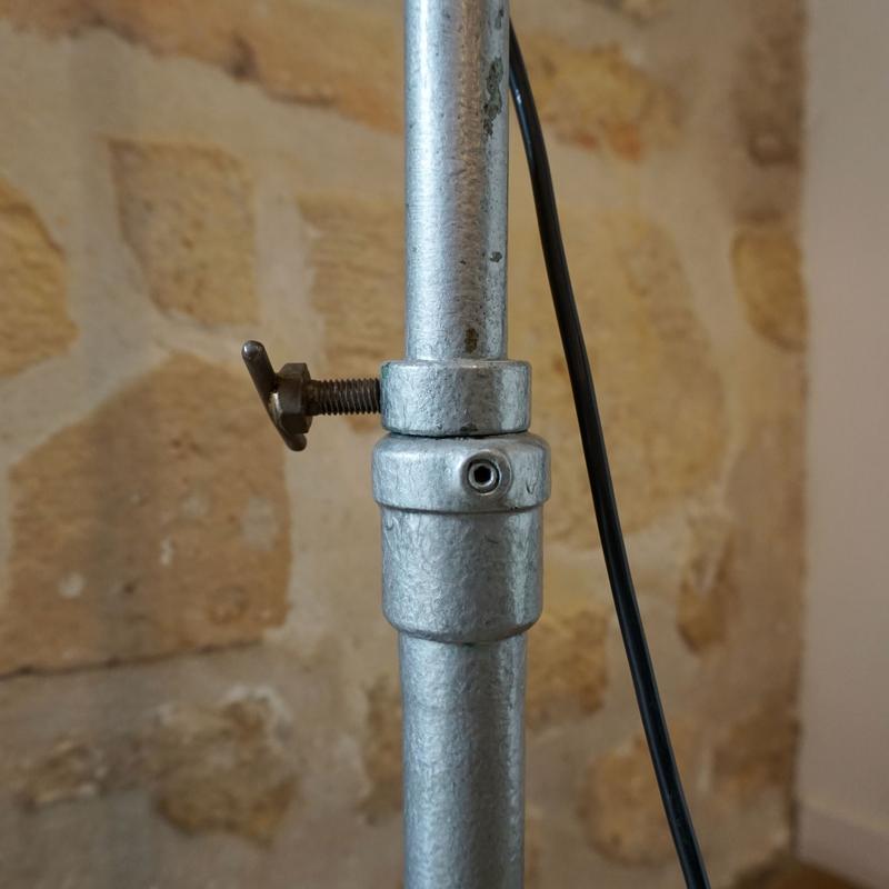 Sur cette lampe, le piètement de la lampe devait être trop encombrant ou pas assez stable, il l’a donc montée sur un piètement qui lui convenait et créé une molette pour faire tenir l’ensemble!