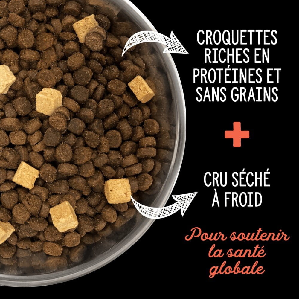 Cette nourriture à base de croquettes et de cru séché à froid pour chats est enrichie de prébiotiques et de probiotiques, favorisant ainsi la santé intestinale des chats. Ce soutien essentiel à la santé digestive assure une digestion et une absorption des nutriments optimales et contribue au bien-être général. L’inclusion d’acides gras oméga-3 et oméga-6 soutient la santé de la peau et du pelage.