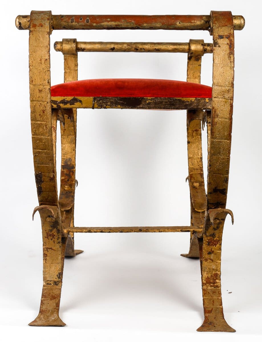 Materials: Gilded wrought iron, red velvet upholstery.