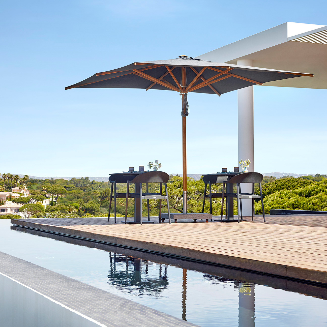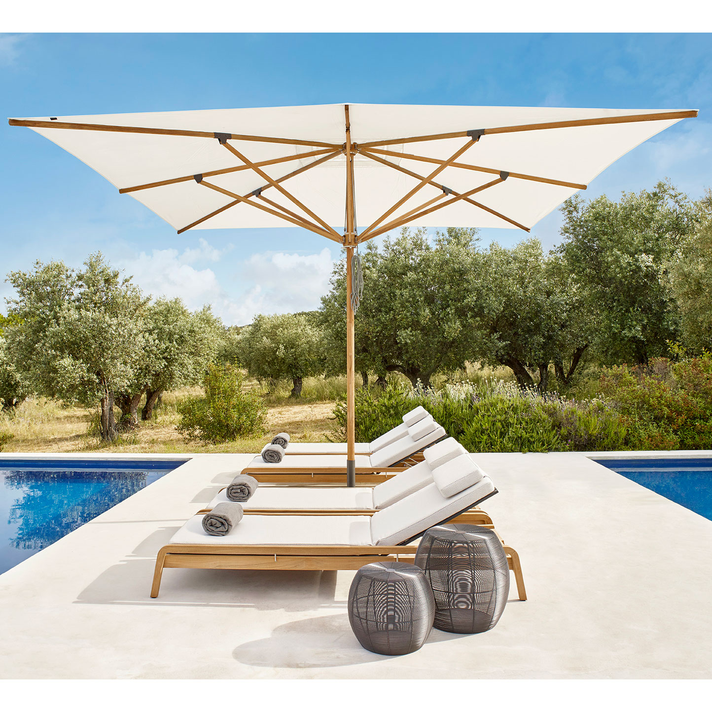 Les parasols sont disponibles dans un large choix de coloris de toile en tissus acrylique teinté en masse lavage en machine à l’eau froide (laine) – séchage à l’air.