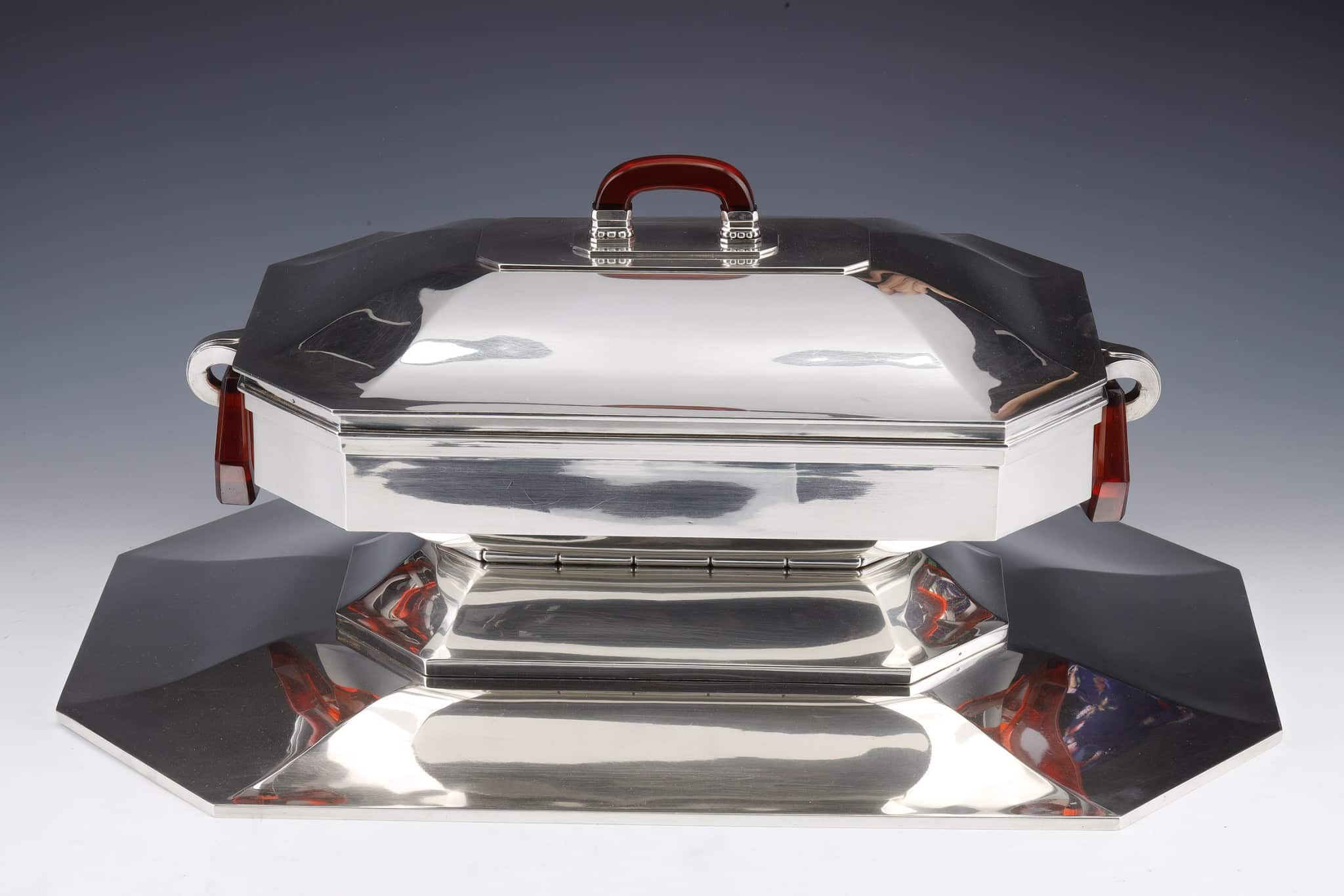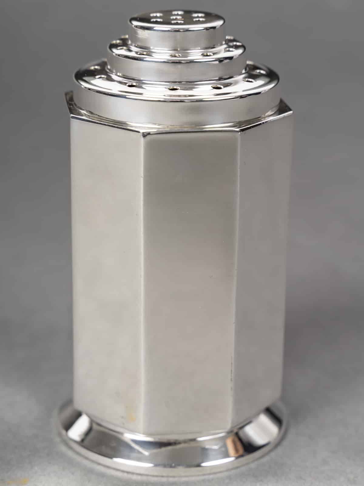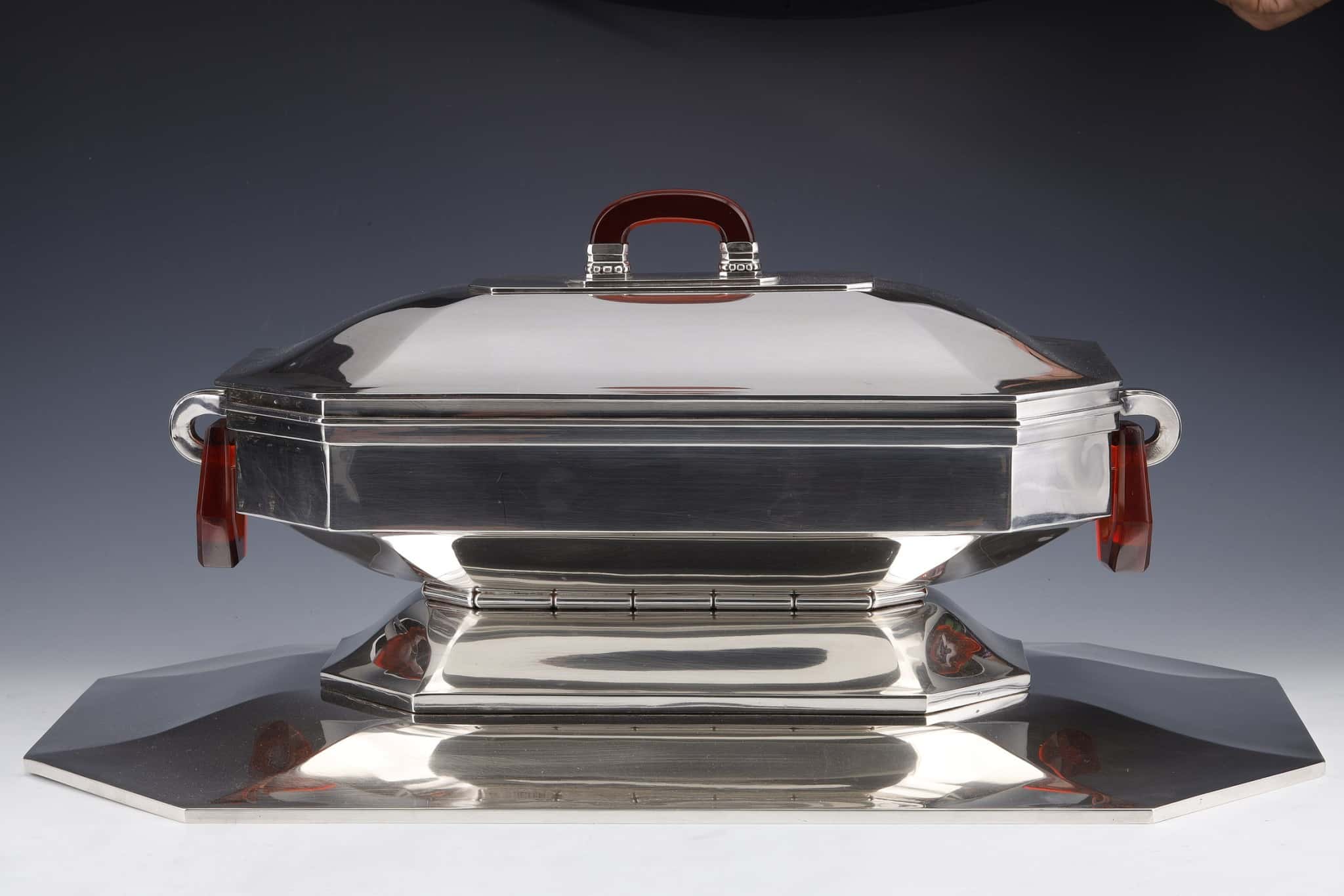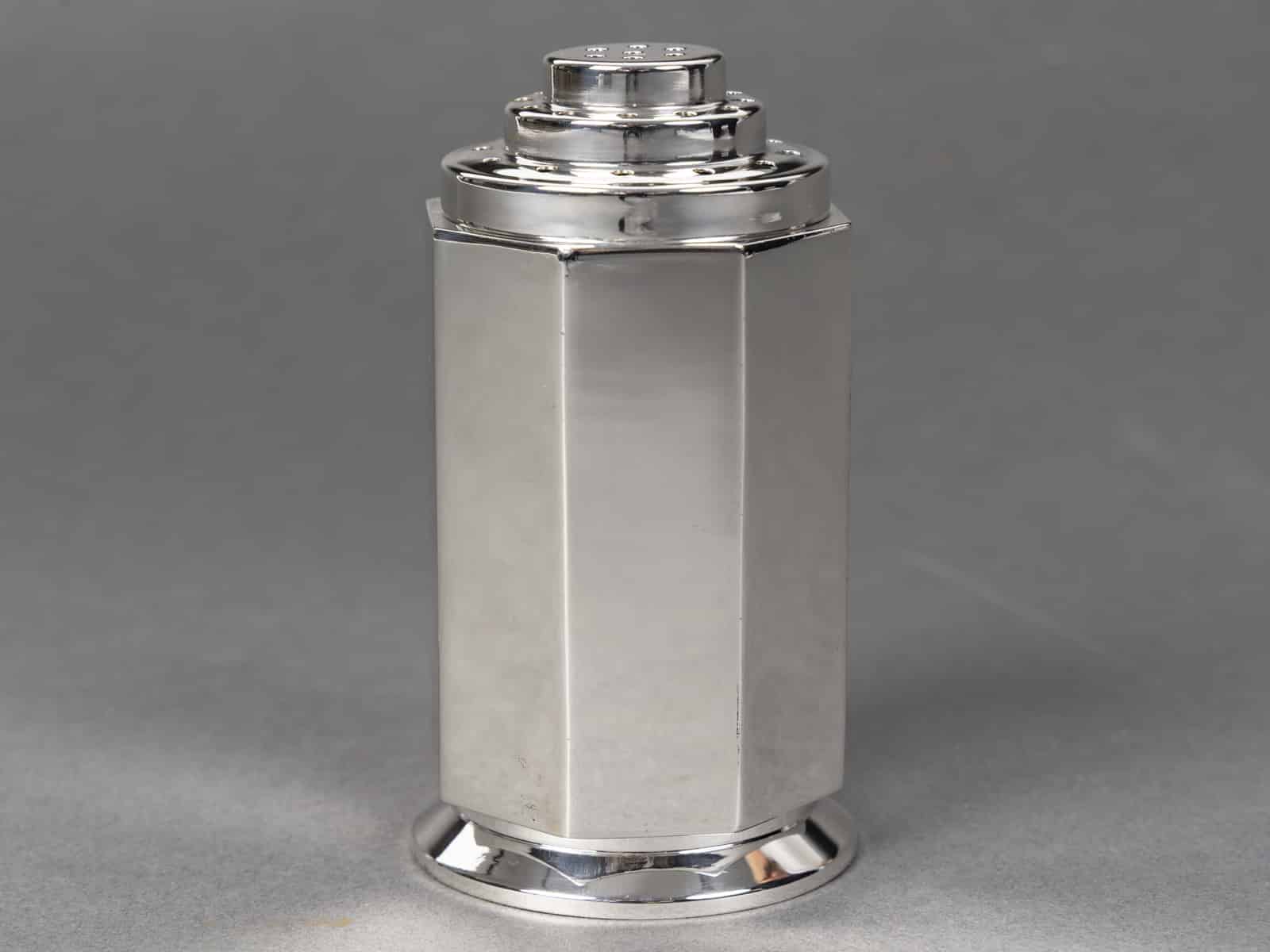 Service à thé et café en métal argenté de style moderniste composé d’une théière, une cafetière, un sucrier et un pot à lait.