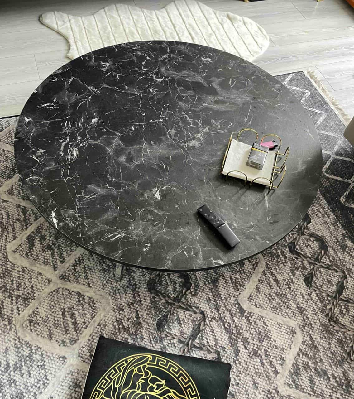 Table basse en bois marbré avec 3 pieds pliable moyen marbre pour salon très tendance et très pratique.