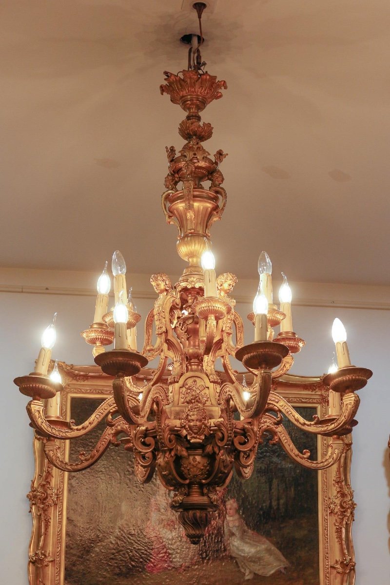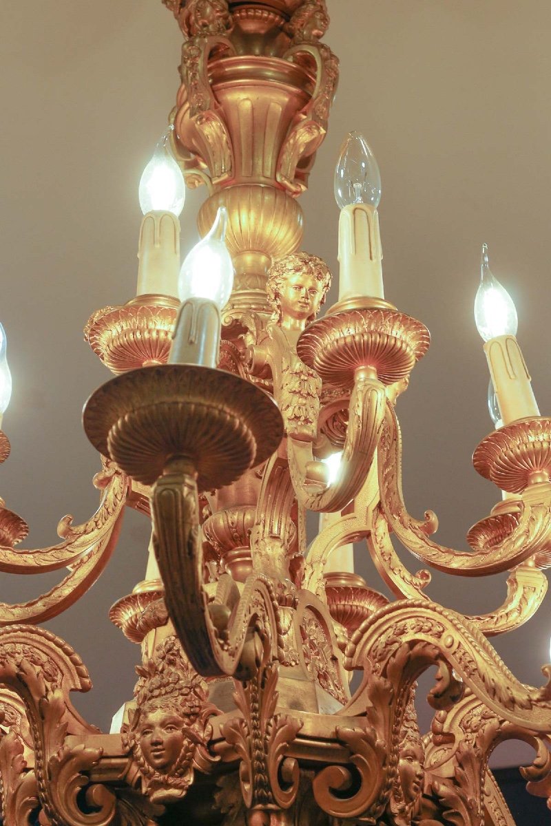 Beau lustre Napoléon III à seize bras de lumières en bronze doré, sculptures d’enfants et masques de femme